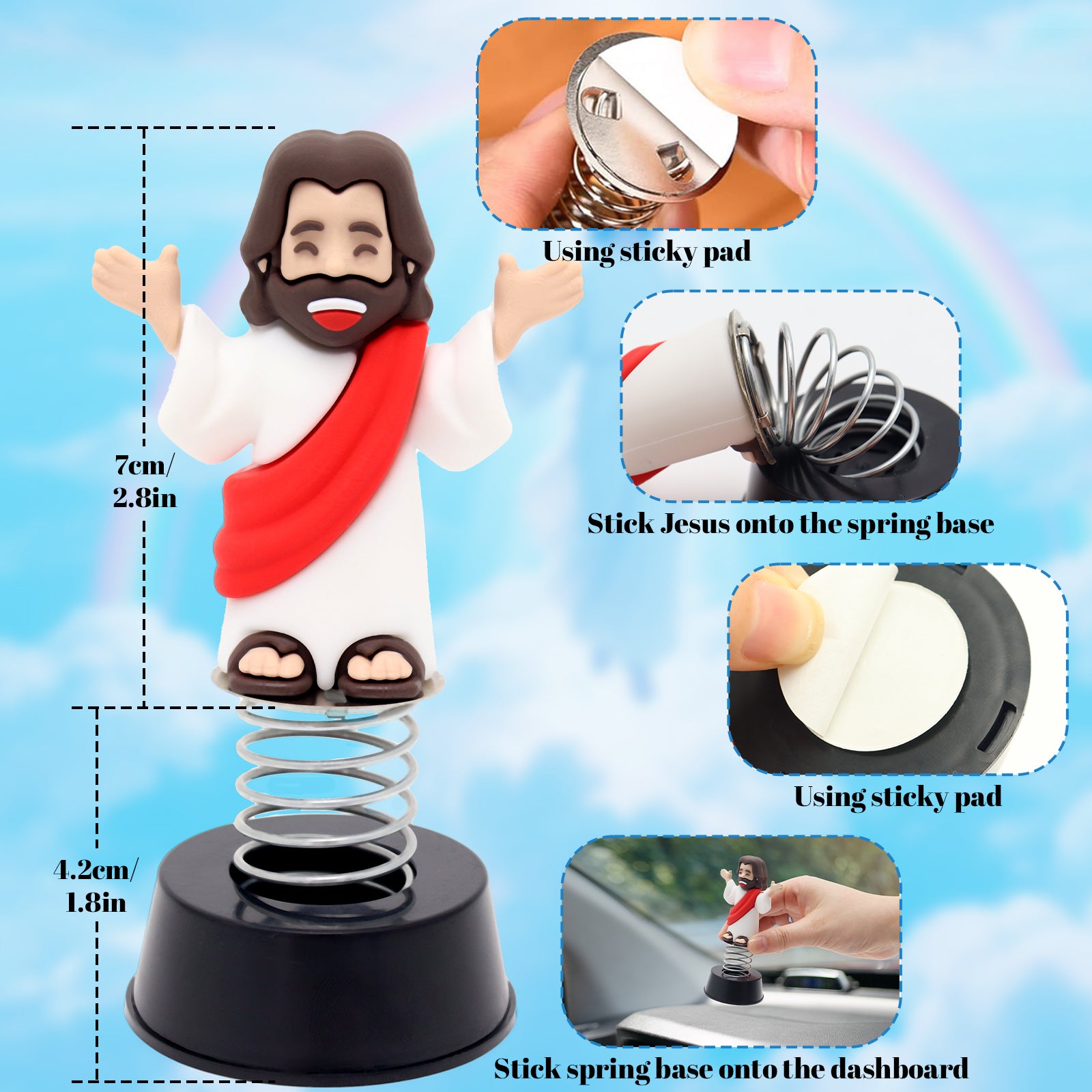 - [Size & Instruction]: The single jesus figure height is 2.75", width is 2.55", deepth is 0.98". The spring base height is 1.77", width is 1.96", deepth is 1.96". Could be sticked on any dashboard, desk, or smooth surface with strong adhesive pad easily.