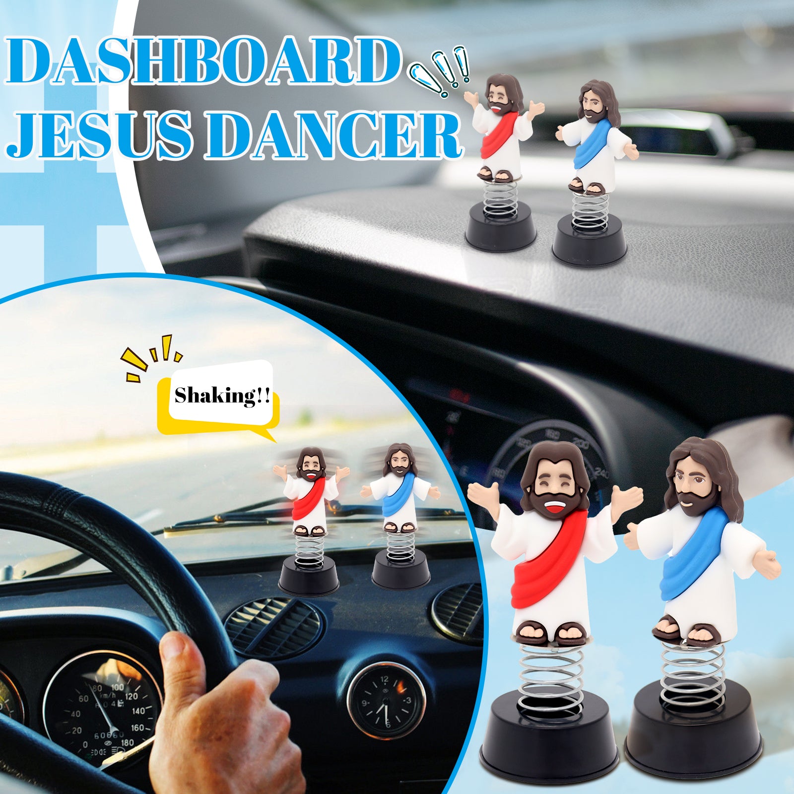 - [Including]: Package includes 1 blue jesus bobblehead, 1 spring base, 4 pcs sticky pads. According to your choice to stick the jesus bobblehead on the spring base or not.