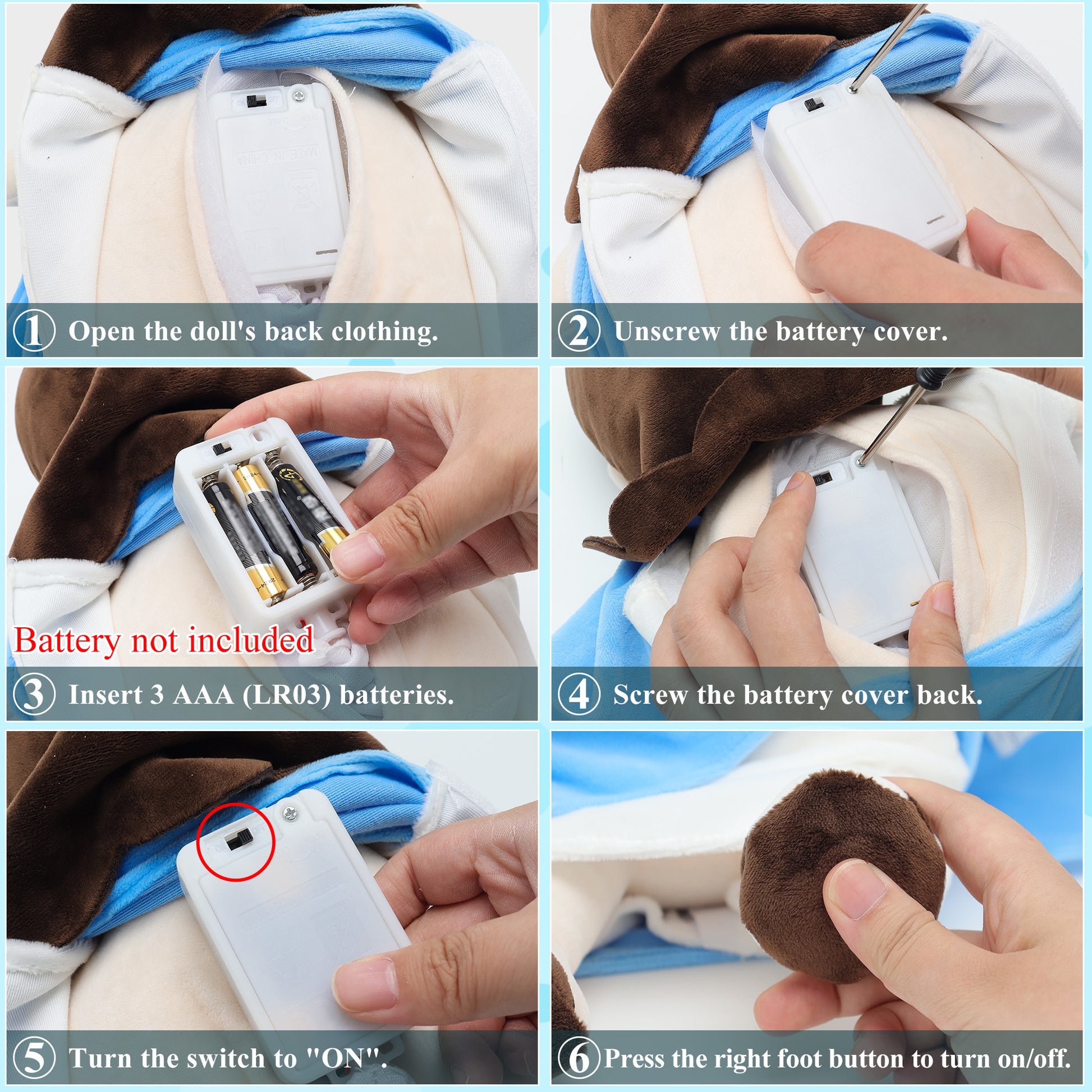 - [Easy Operation] Battery not included. First install 3 new size 7 batteries according to the rules;Keep the battery switch at the back in the state of “ON” (do not keep it in the “OFF” state);Press the paw of the right foot (start button).