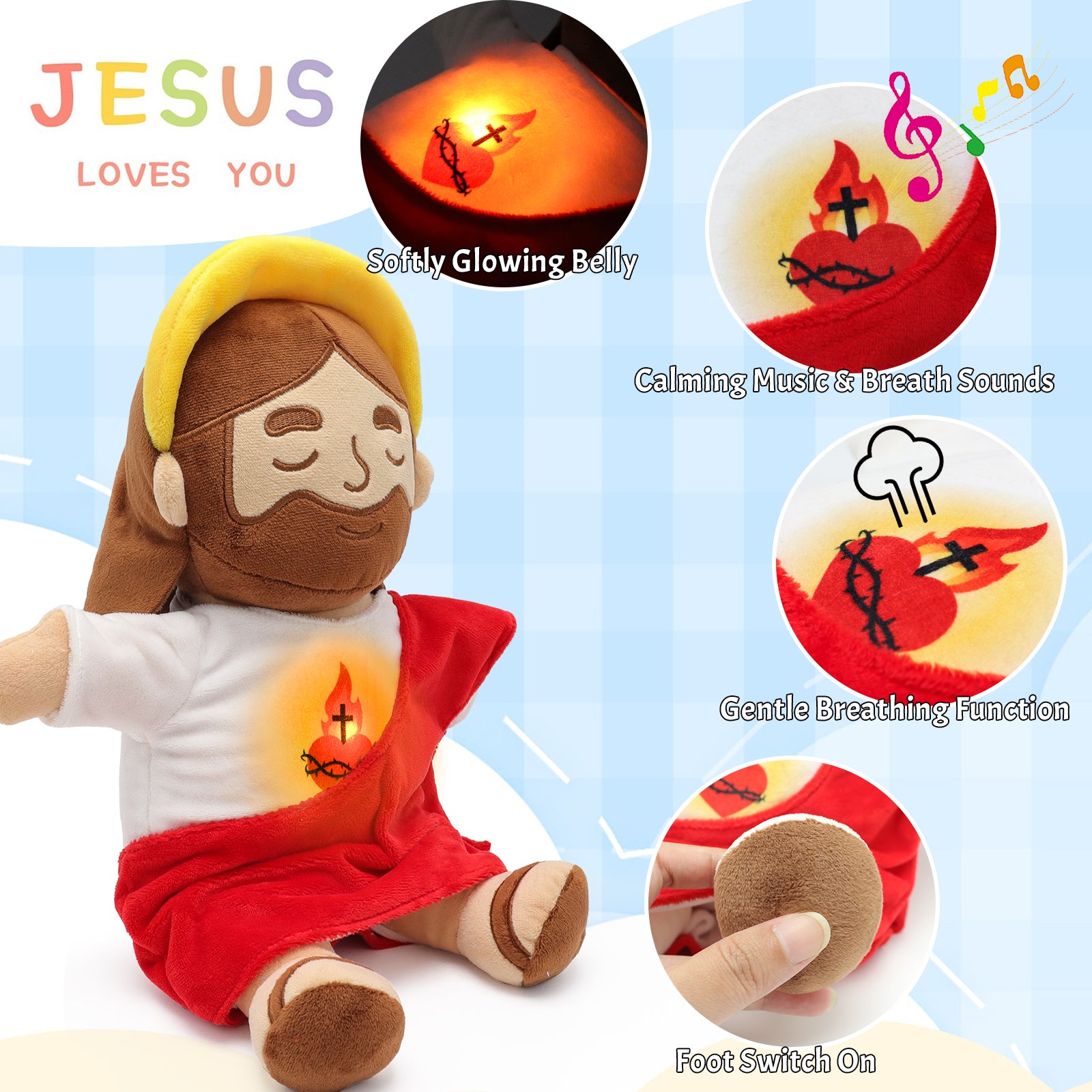 - Light & Sound Features: Our Jesus plush toy includes a softly glowing belly, calming music, breathing sound, and a gentle breathing function. With 8 sound options—breathing, white noises, piano melodies, and multi soothing songs—it creates a comforting atmosphere to help your child drift off to sleep peacefully.