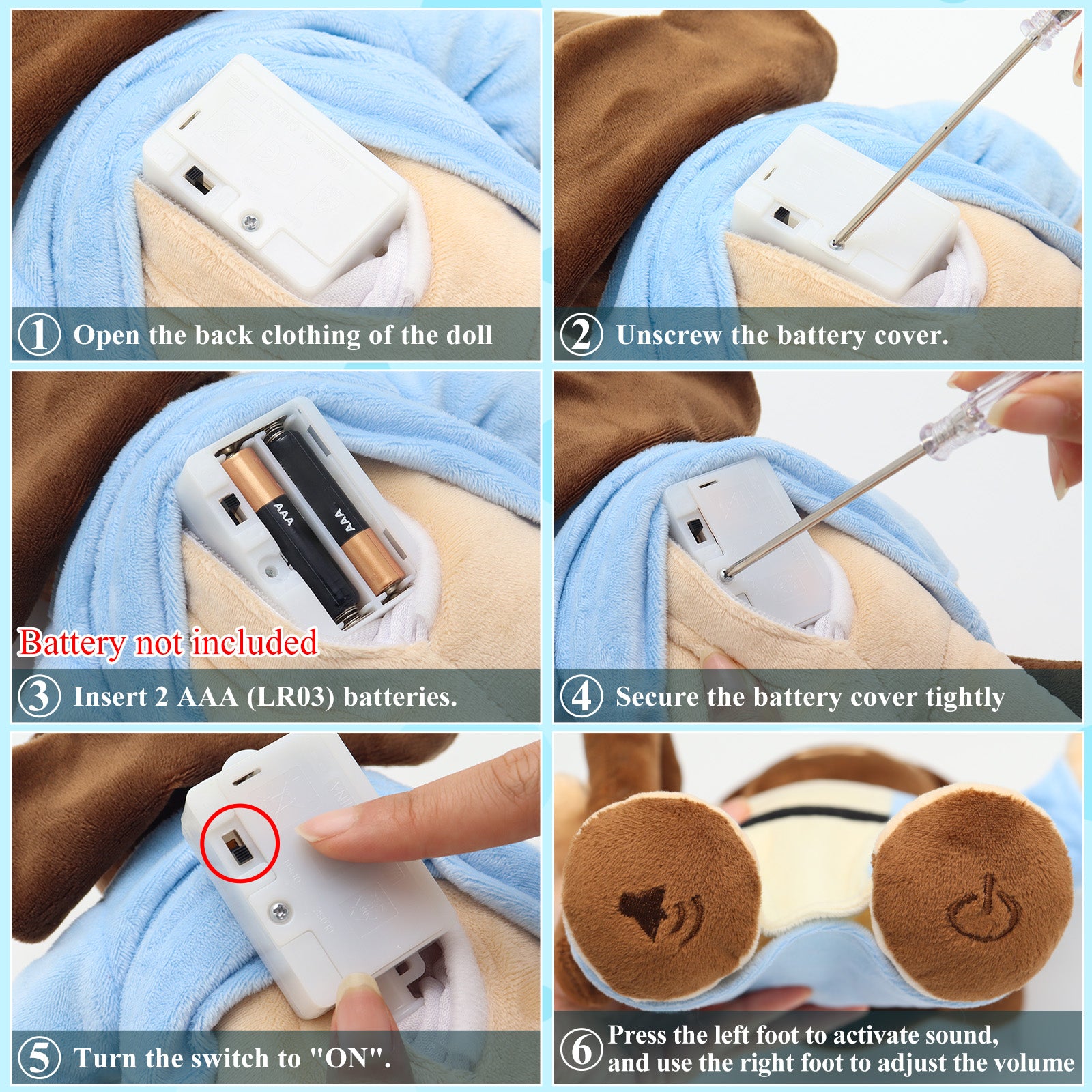 - Easy to Operate: Installing and using the Jesus plush is simple and parent-friendly. Insert 3 AAA batteries (not included), switch the power to “ON,” and press the buttons to explore different modes: Press the right hand to activate voice greetings; Press the left hand to adjust volume; Press the right hand again to switch to Bible stories and songs. Each press cycles through a new mode, creating a fun and interactive way for children to learn about Jesus