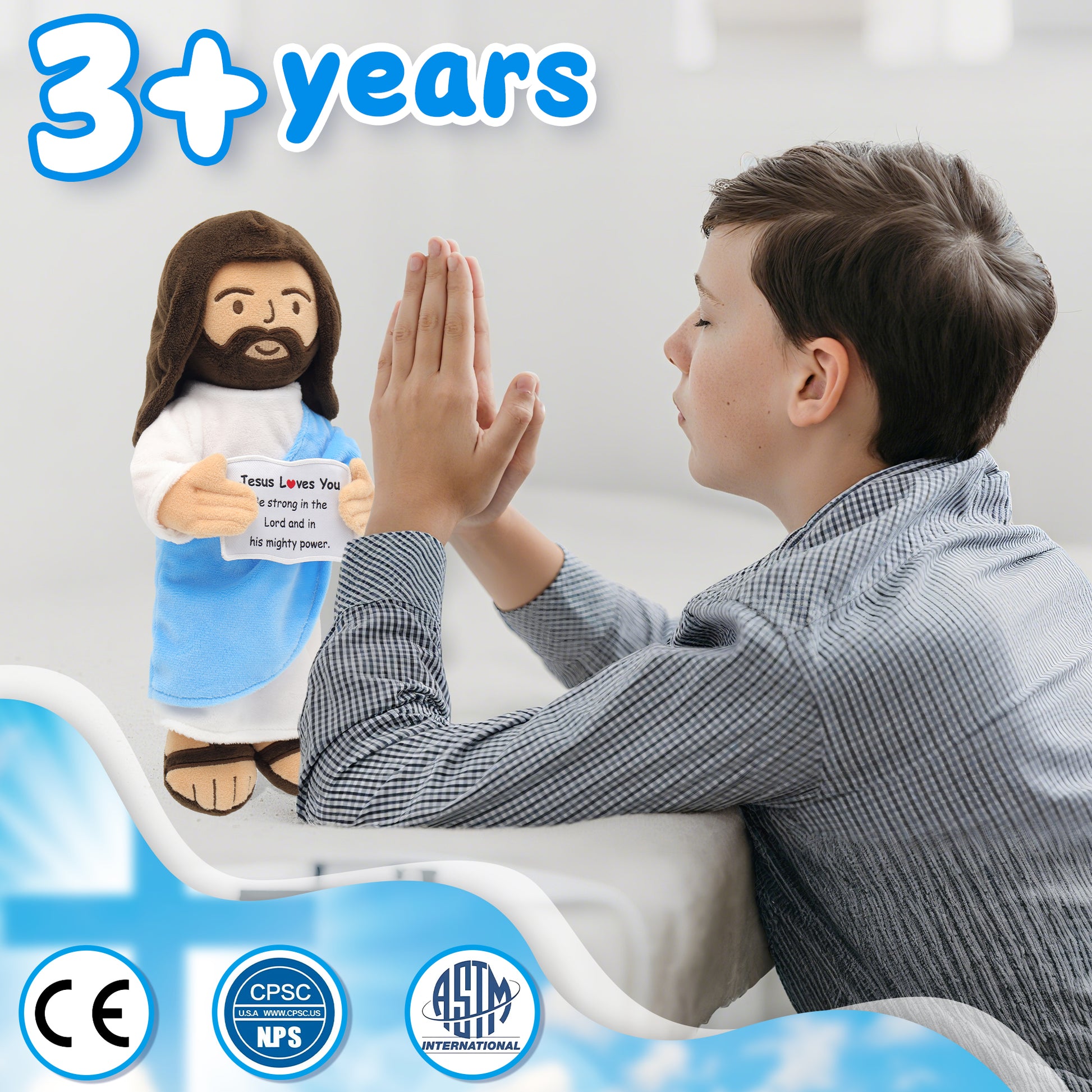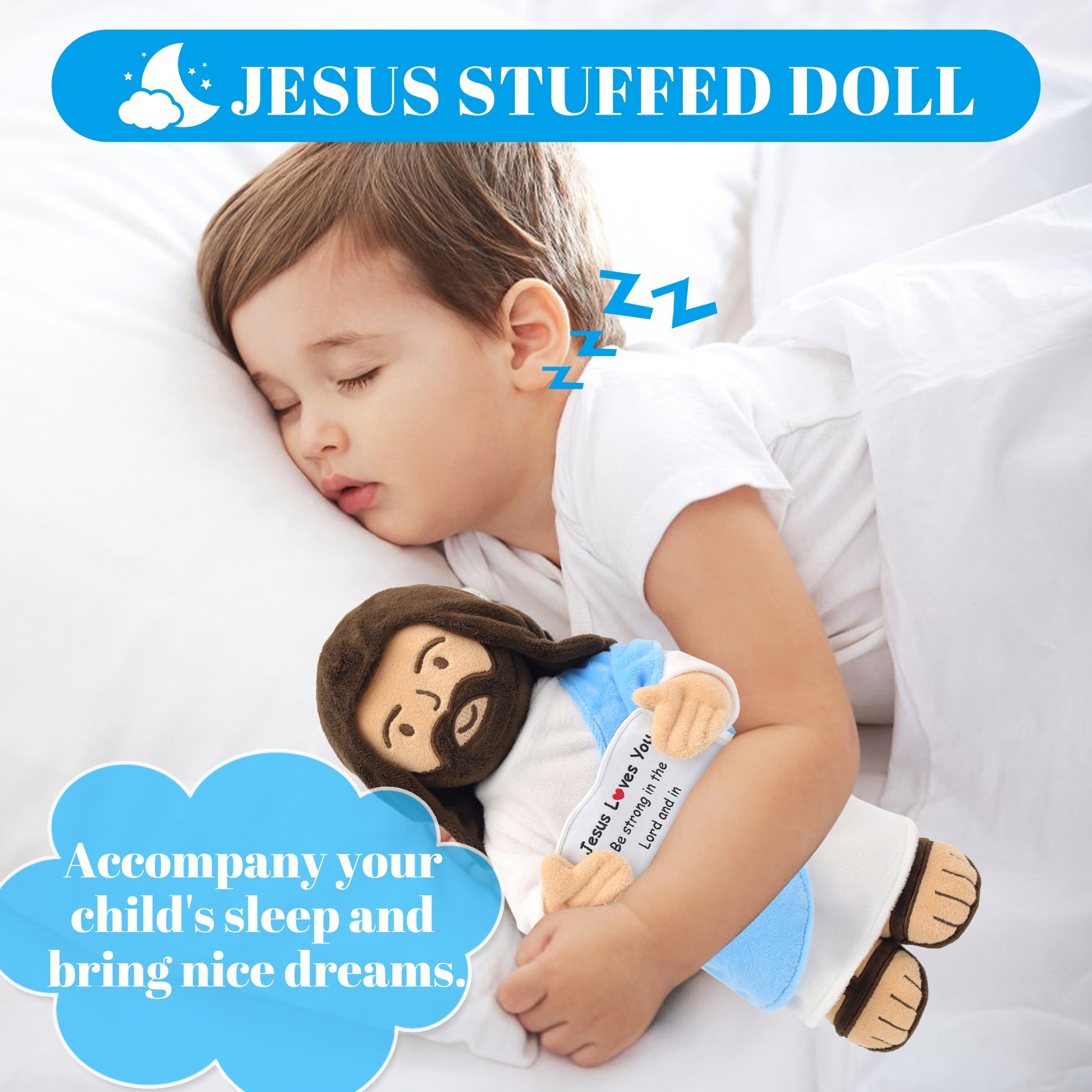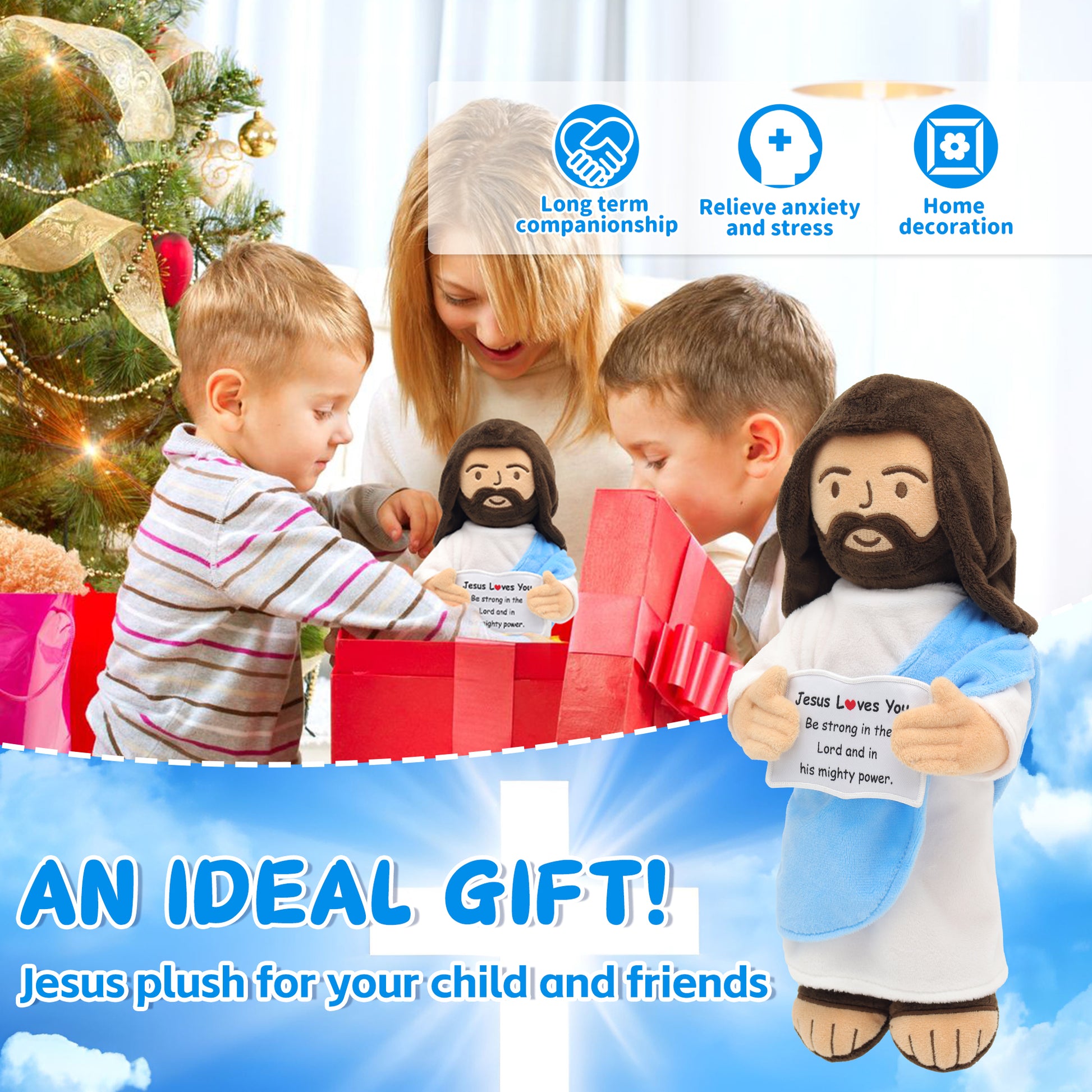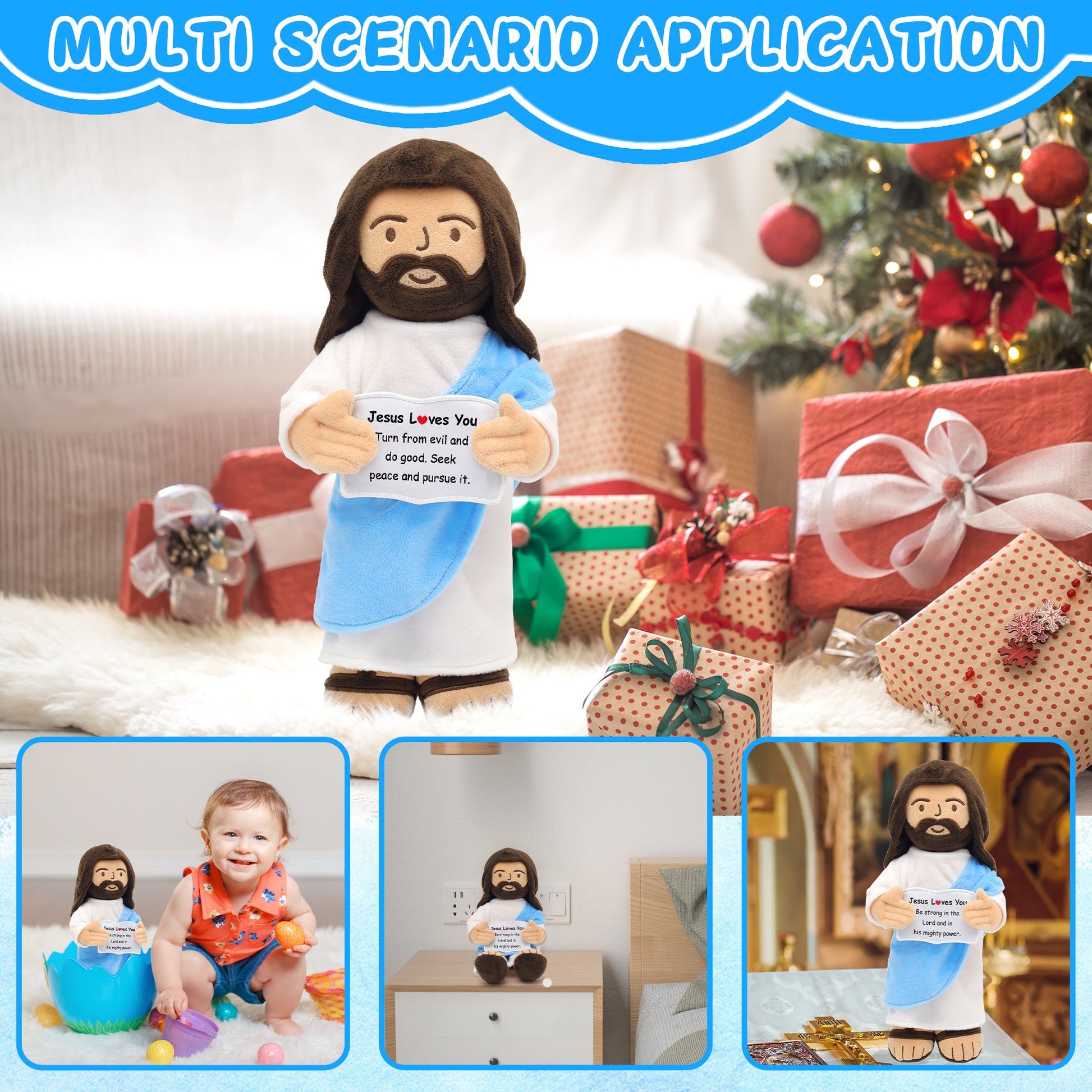 - [Design]: The 13 inch vivid smiled jesus plush doll with a white robe and a blue shawl symbolizing holiness. Holding card with representative quotes in both hands encourages us and brings hope and joy.