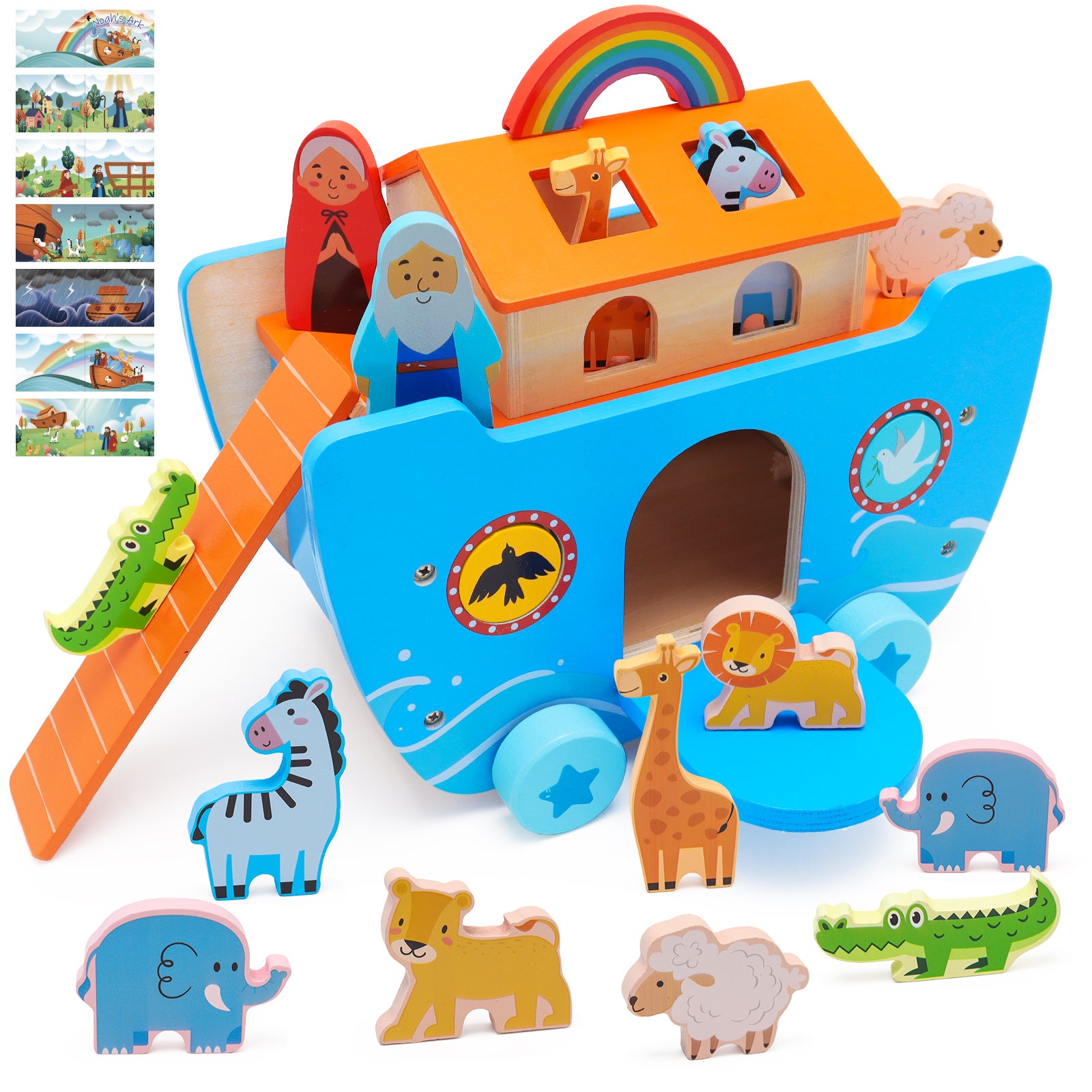 - Noah's Ark Playset: This noahs ark toy Includes 1 ark, Noah and his wife, 2 zebras, 2 elephants, 2 crocodiles, 2 lions, 2 giraffes, 2 sheeps, 1 Pigeon, 1 crow, 1 boarding ladder, 1 Noah storybook, 1 rainbow.