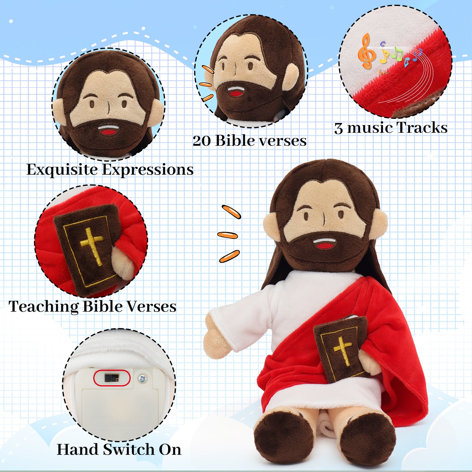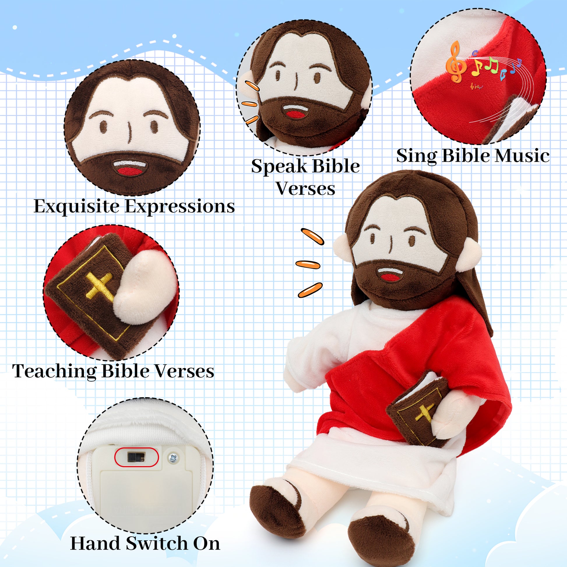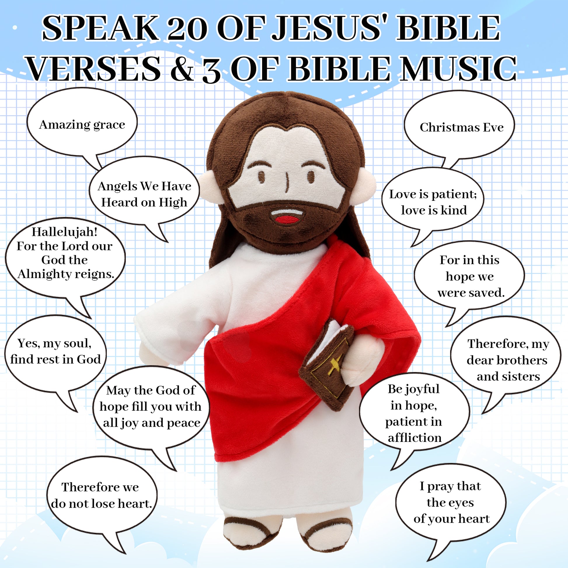 - Jesus Talks With You: Our 13 inch talking jesus plush toy has a built-in speaker that speaks 20 of Jesus' Bible Verses and 3 of Bible Music. Whether it's during bedtime or when they need a little extra comfort, this plush will be their snuggle buddy for those cozy moments.