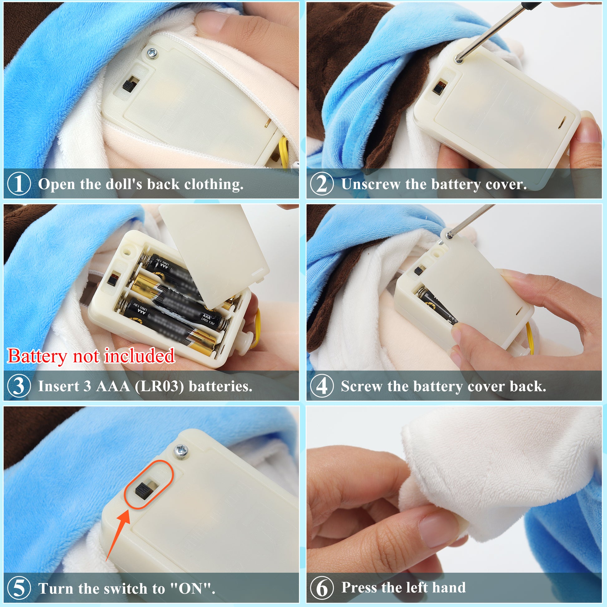 - Effortless Operation: Setting up our breathing Jesus plush is a breeze. Simply install 3 new size 7 batteries (not included) as per the instructions, flip the switch to the "ON" position, and press the right hand to activate the speaking mode. It's a fun and interactive way to teach children about Christianity.