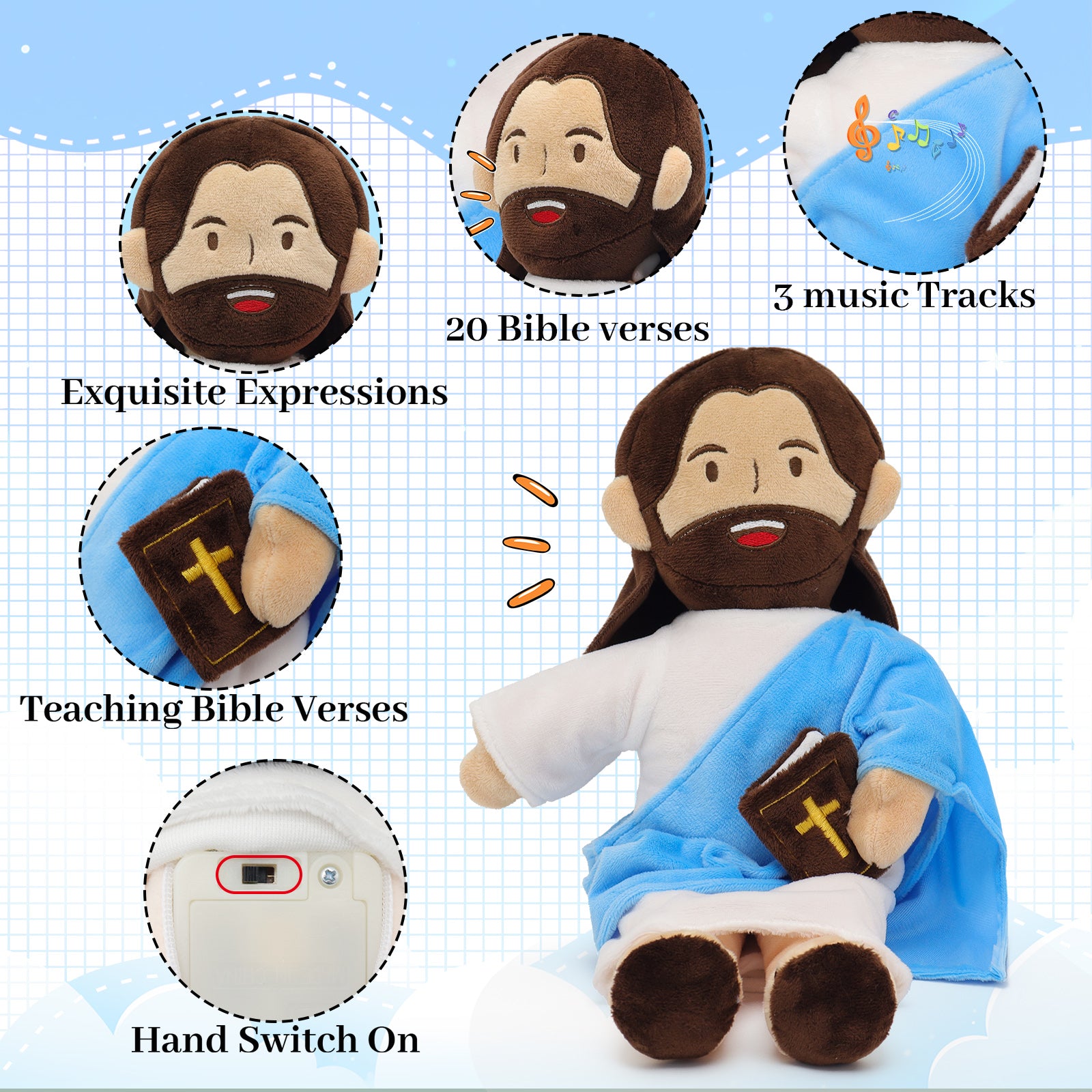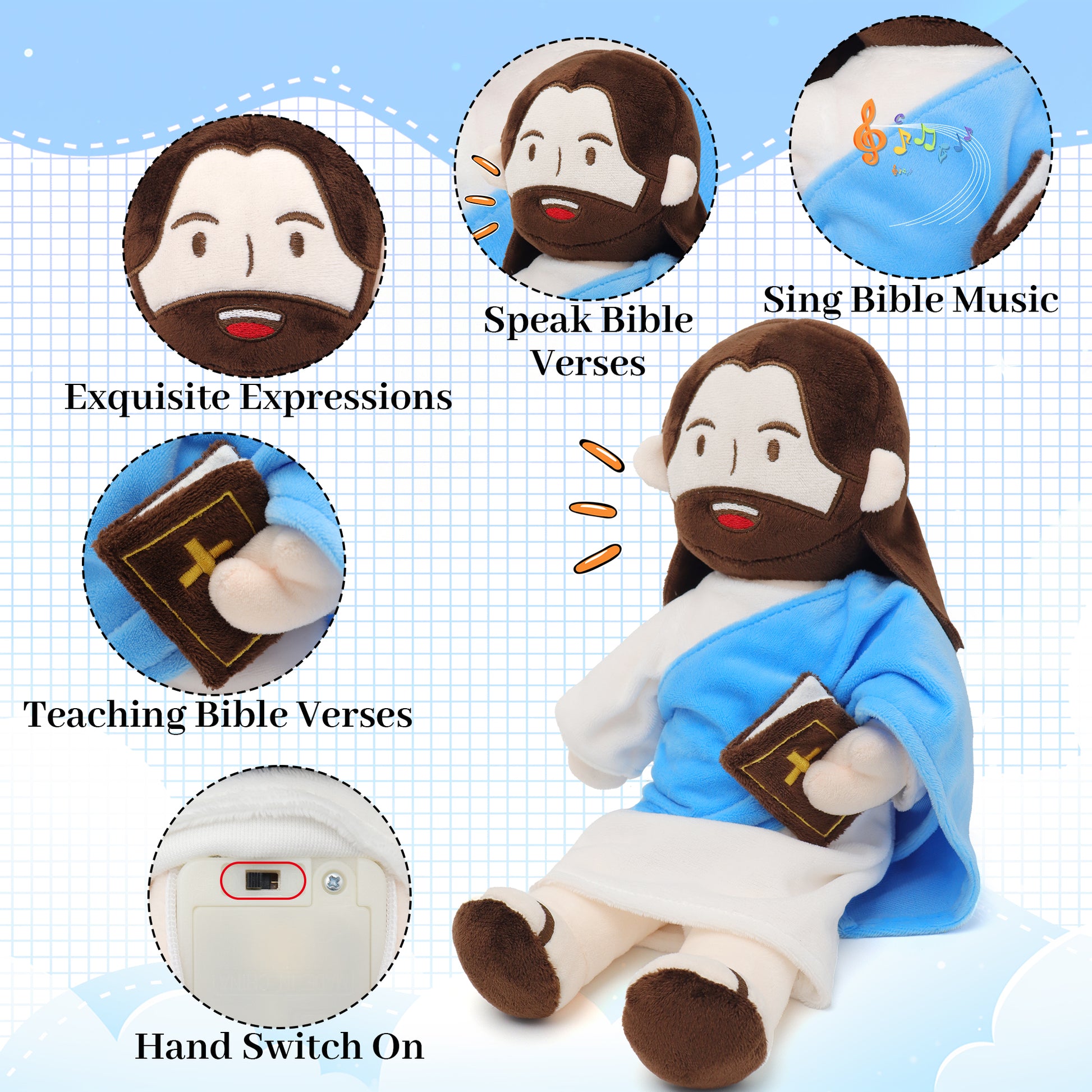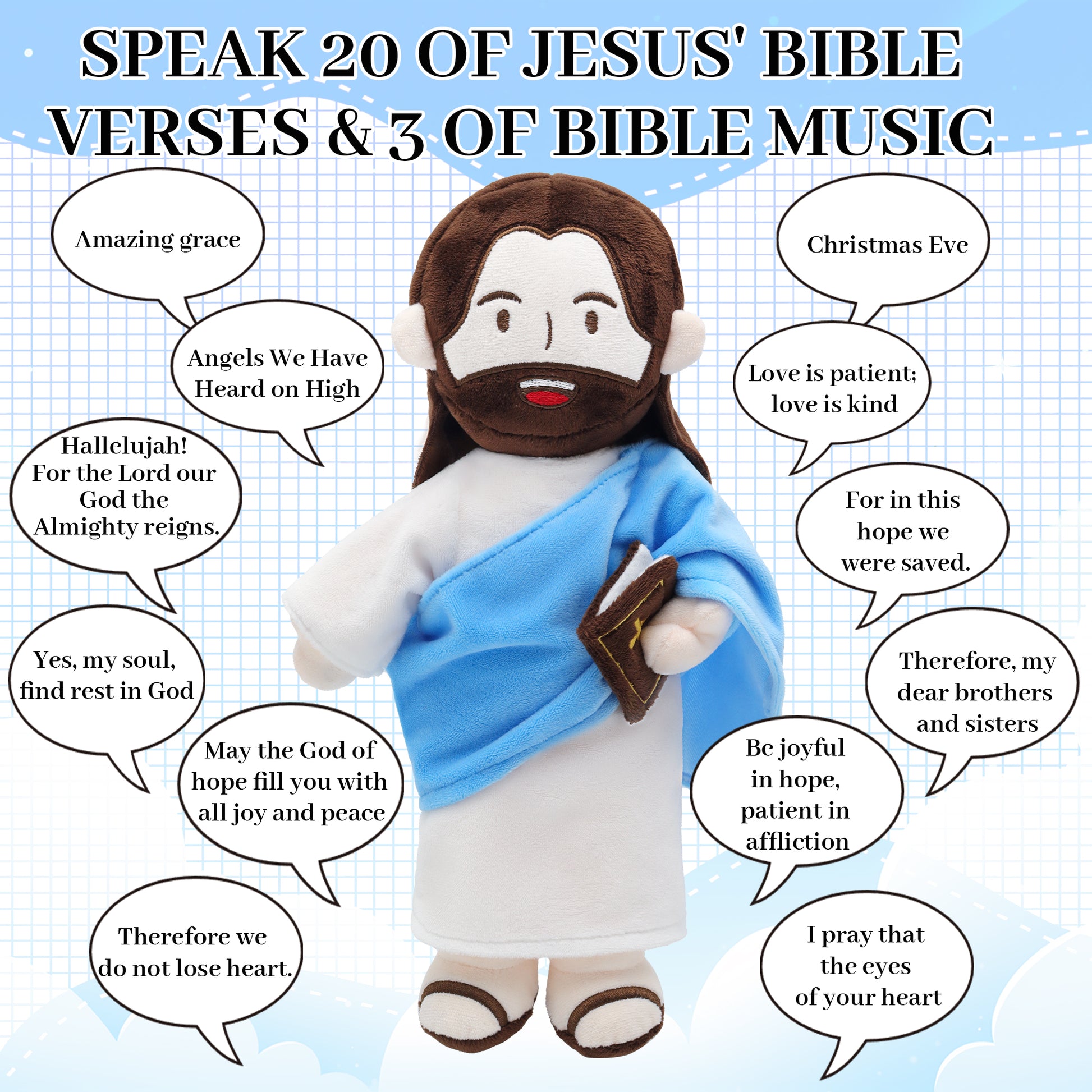 • Jesus Talks With You: Our 13 inch talking jesus plush toy has a built-in speaker that speaks 20 of Jesus' Bible Verses and 3 of Bible Music. Whether it's during bedtime or when they need a little extra comfort, this plush will be their snuggle buddy for those cozy moments.