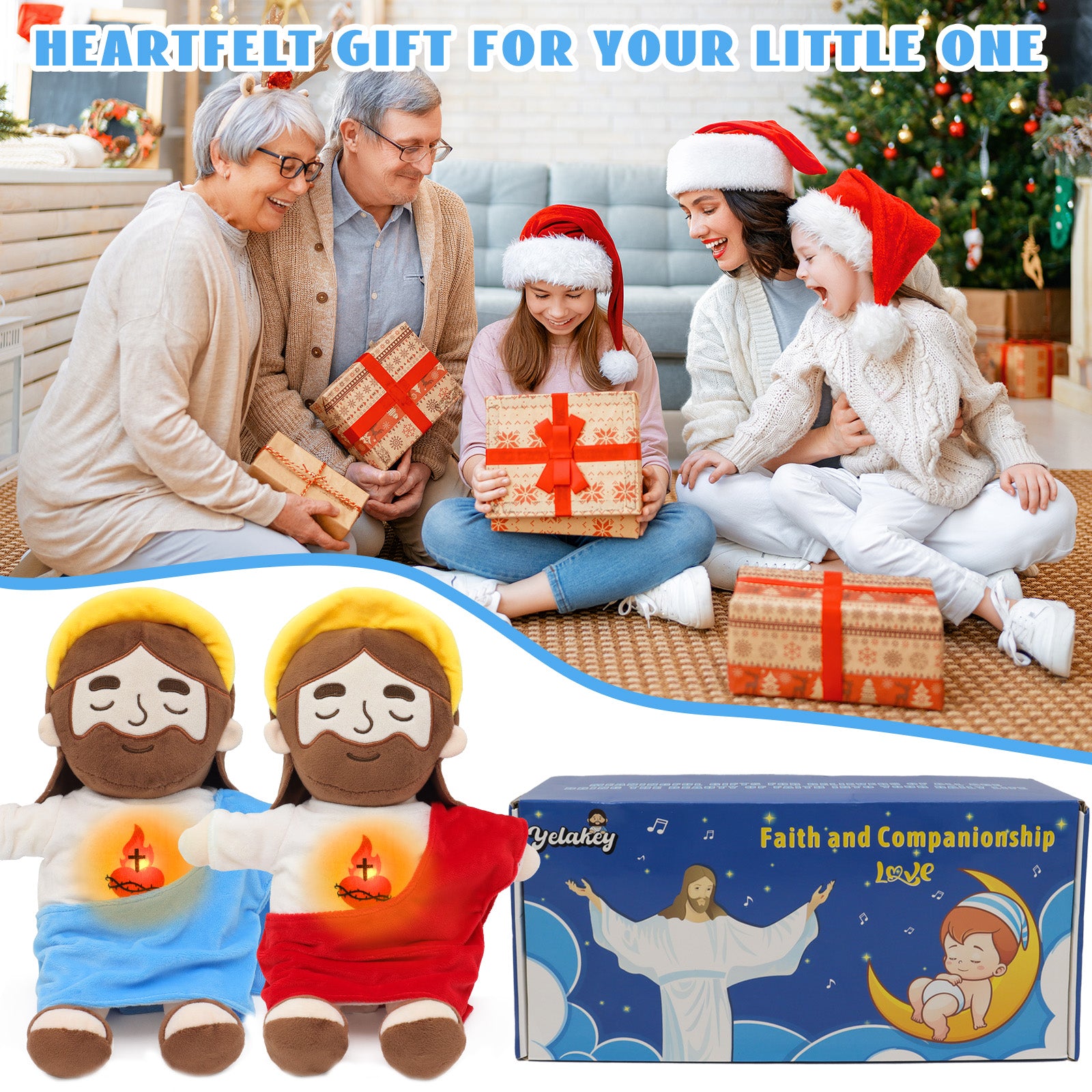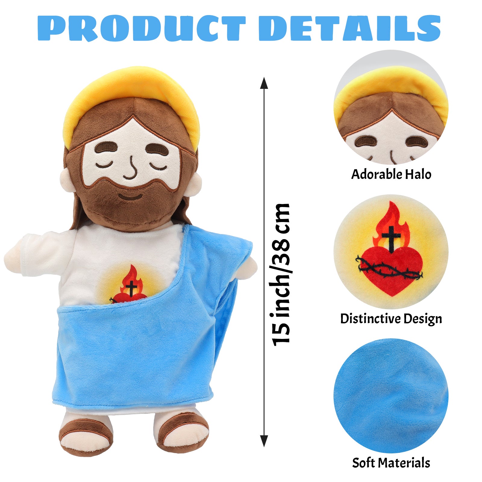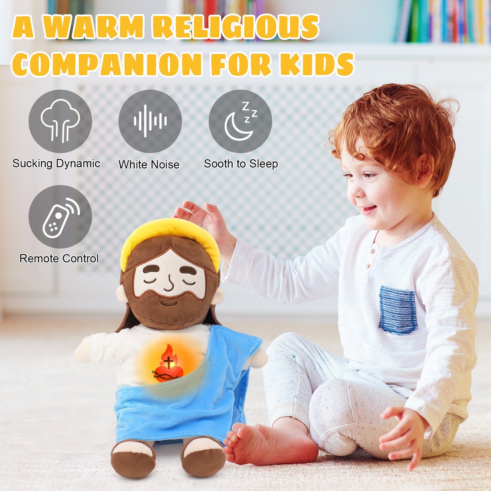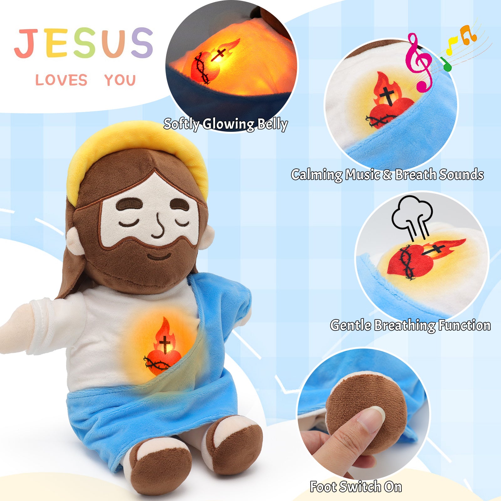 - Light & Sound Features: Our Jesus plush toy includes a softly glowing belly, calming music, breathing sound, and a gentle breathing function. With 8 sound options—breathing, white noises, piano melodies, and multi soothing songs—it creates a comforting atmosphere to help your child drift off to sleep peacefully.
